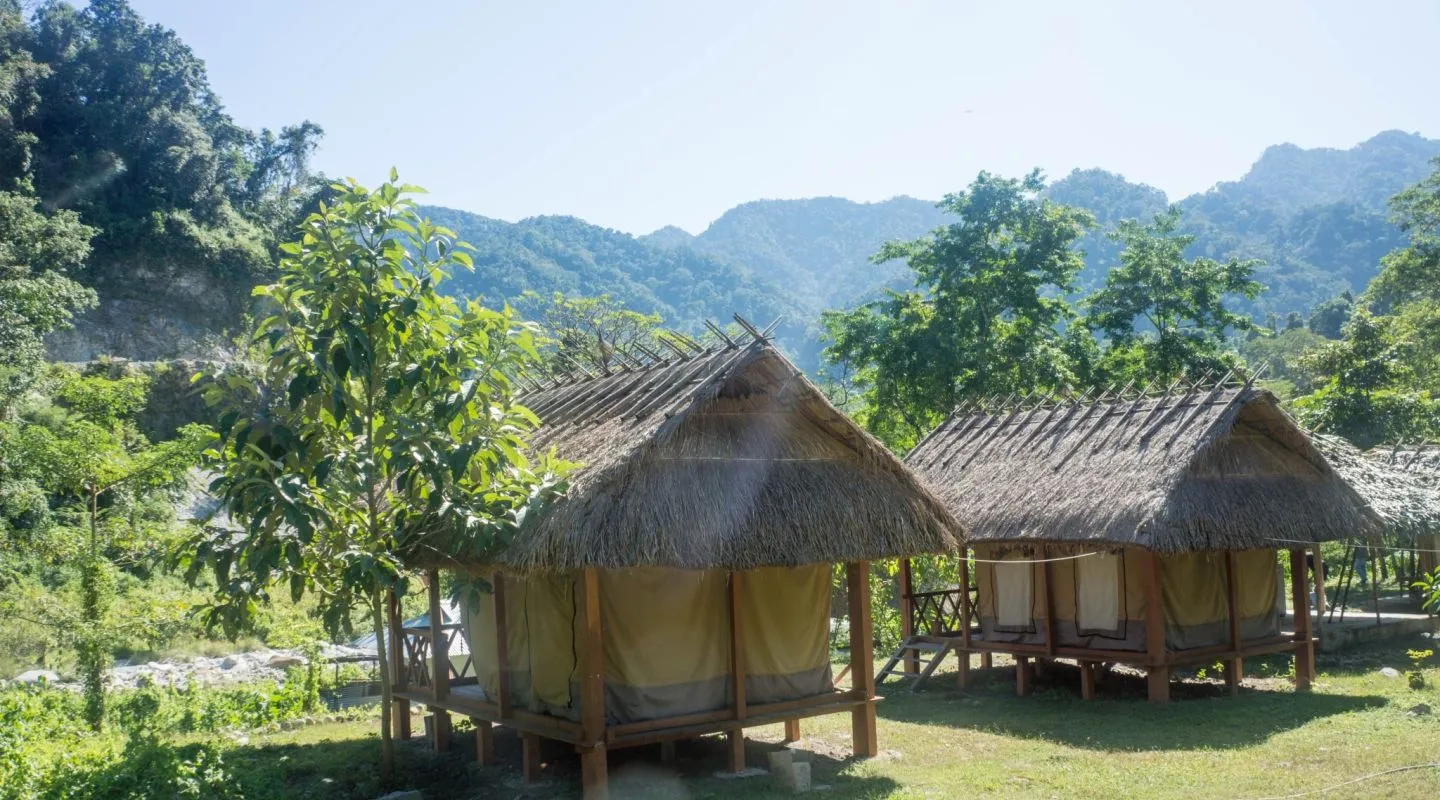 Bhutan’s jungle camp near Royal Manas National Park, offers an authentic experience with spacious, tented camps equipped with modern amenities and a communal dining area, all showcasing traditional Khengpa thatched roofing crafted by local villagers.